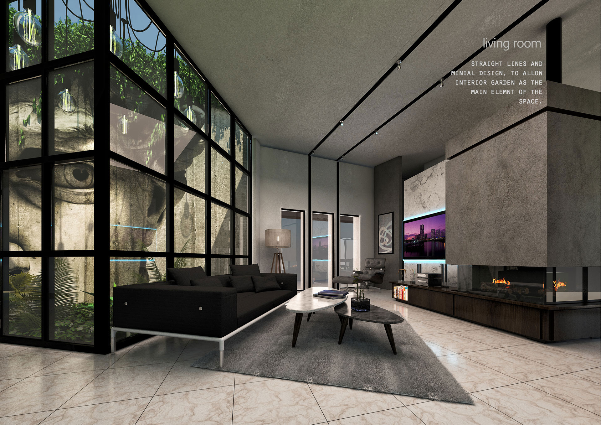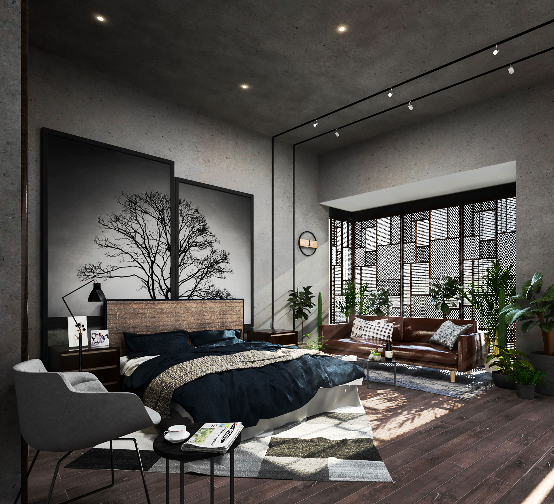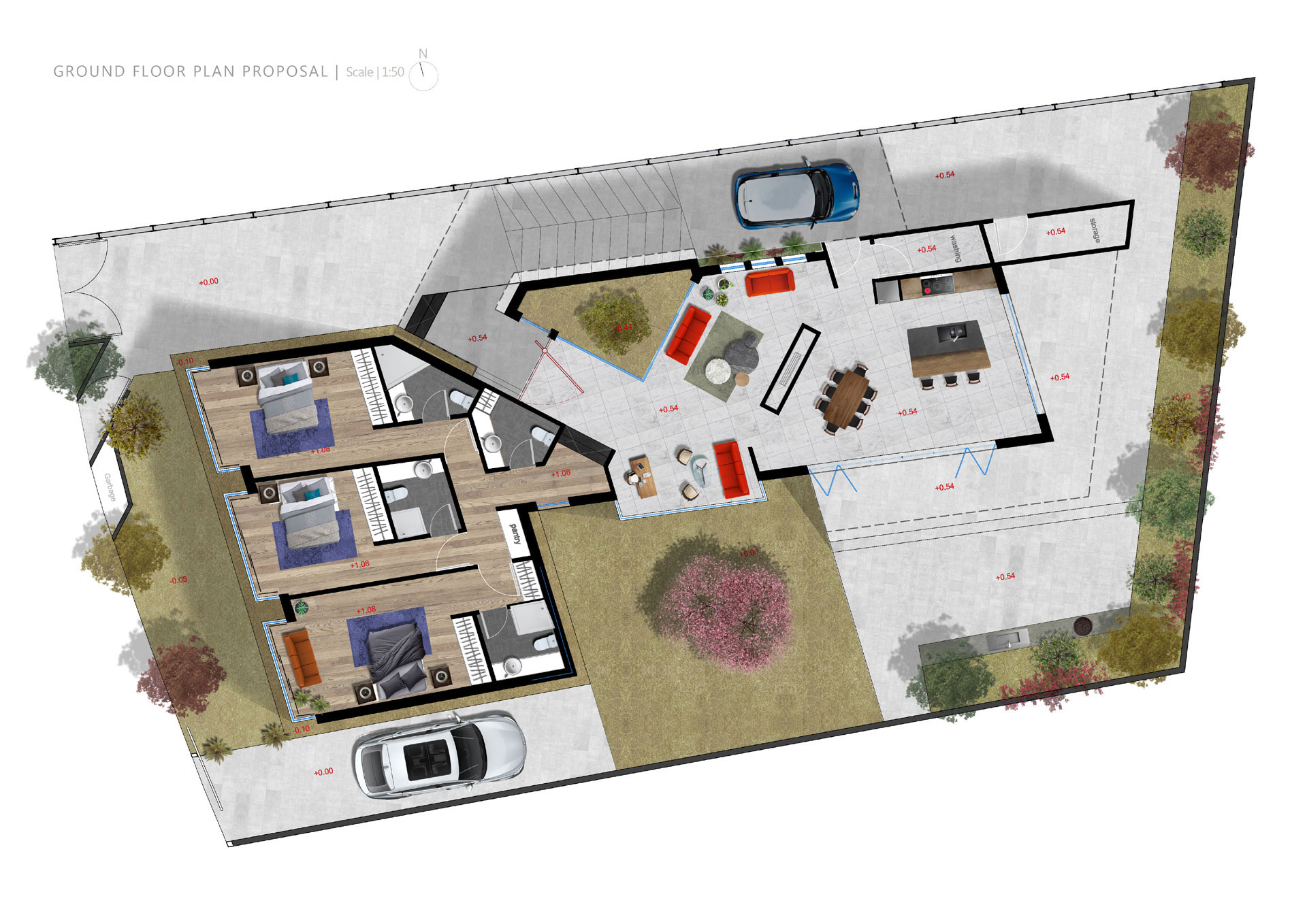 The special arrangement determined as follows, living spaces are created along the axis of the door parallel to the grid line. The sleeping areas are equally divided to provide privacy from the living spaces and keep common areas free.